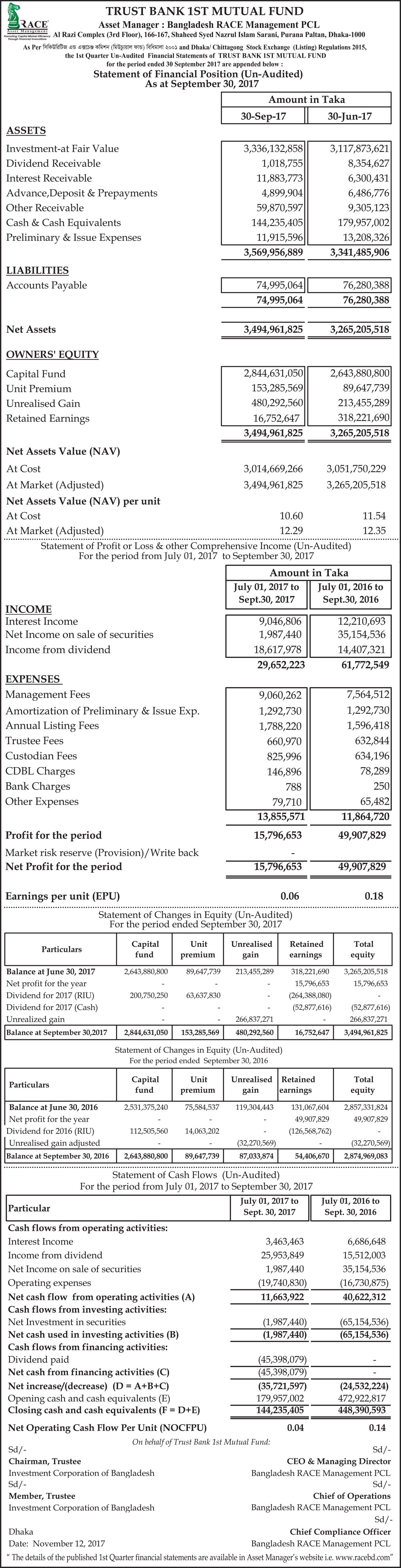 Statements of Financial Position (Un-audited) of Trust Bank 1st Mutual Fund