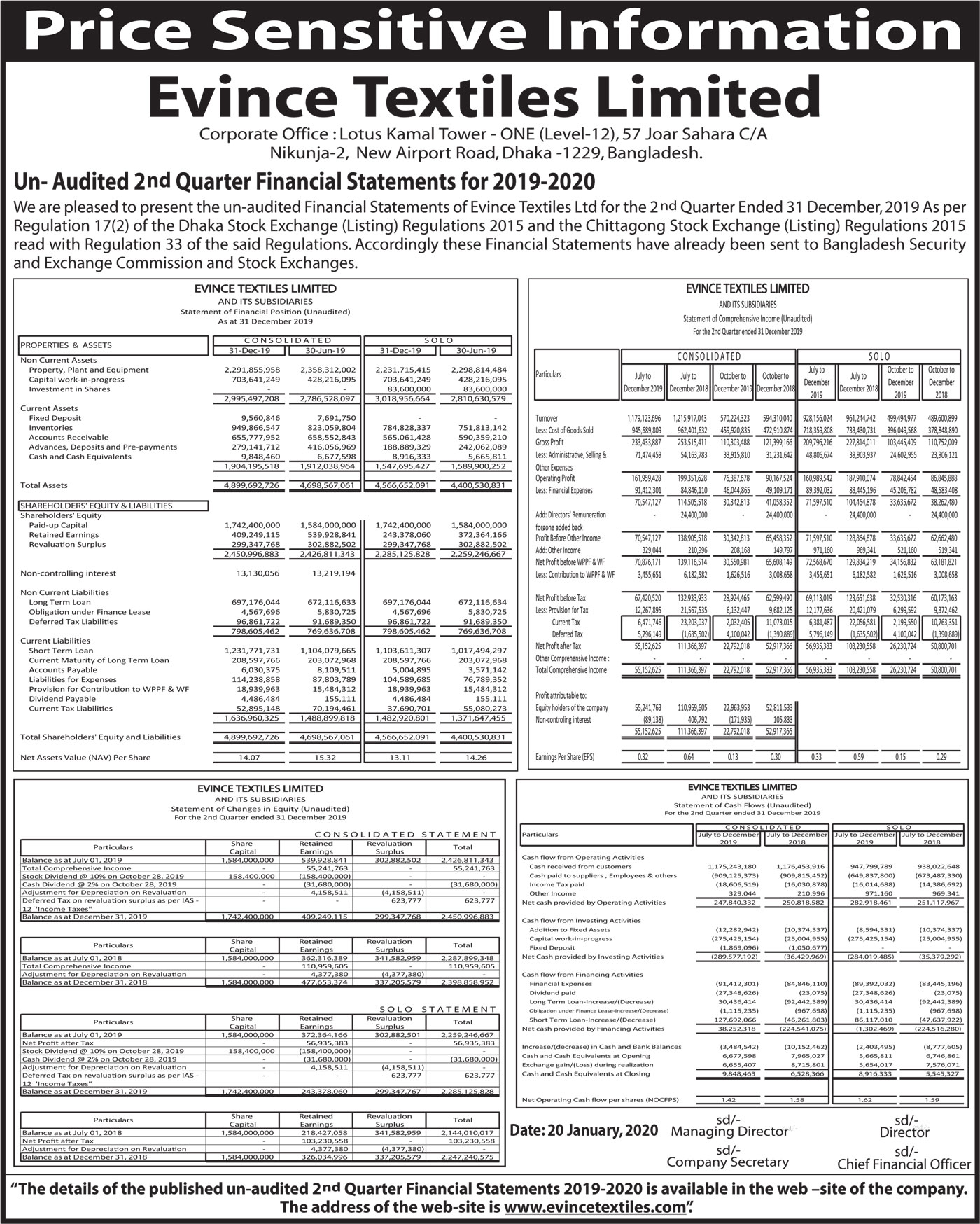 Un-Audited 2nd Quarter Financial Statements Evince Textiles Ltd