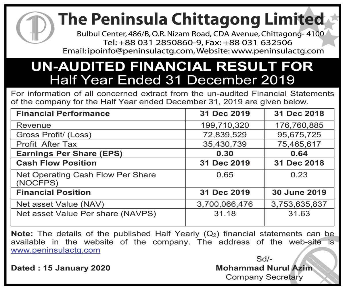 Un-Audited Financial Result Of The Peninsula Chittagong Limited
