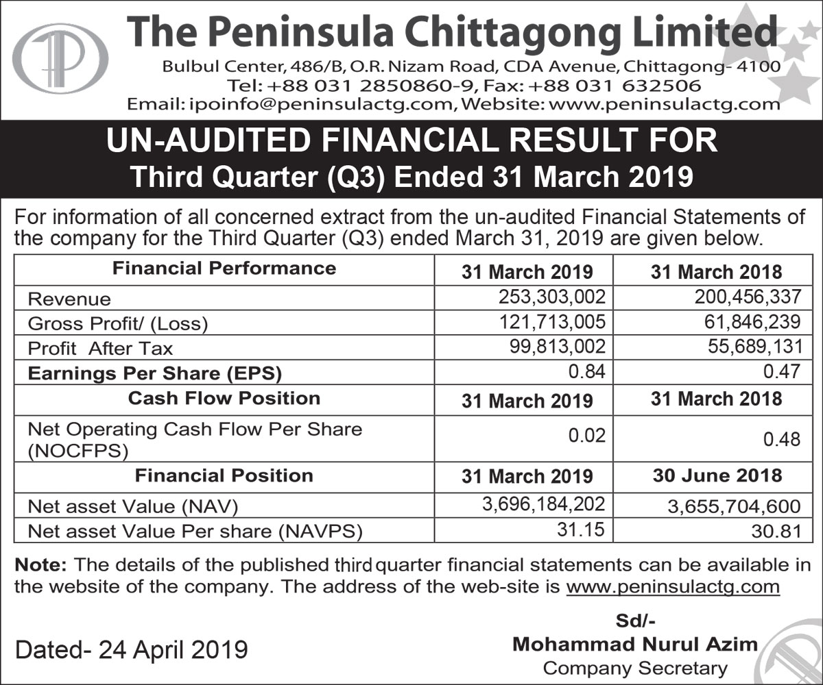 Un-Audited Financial Result Of The Peninsula Chittagong Limited
