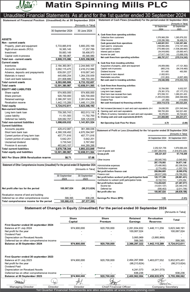 Unaudited Financial Statements of Matin Spinning Mills PLC
