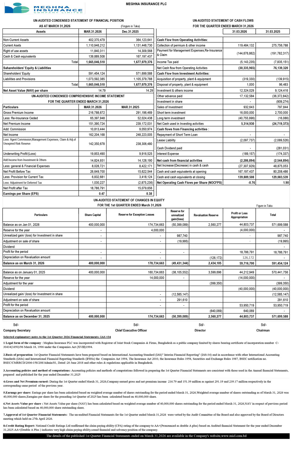 Un-audited Financial Statements of Meghna Insurance PLC