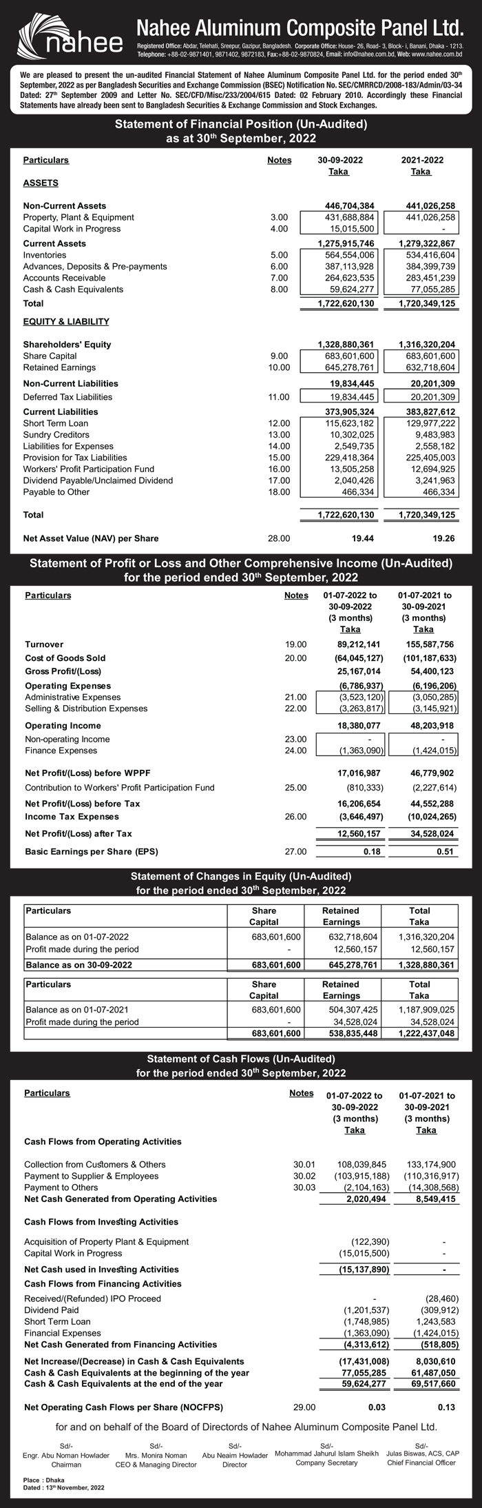 Statements of Financial Position (Un-Audited) of Nahee Aluminum Composite Panel Ltd