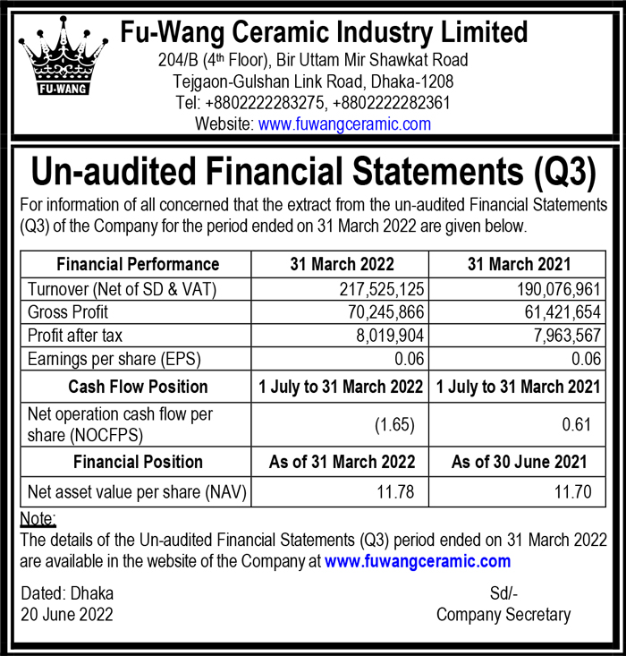 Un-audited Financial Statements (Q3) of Fu-Wang Ceramic Industry Limited