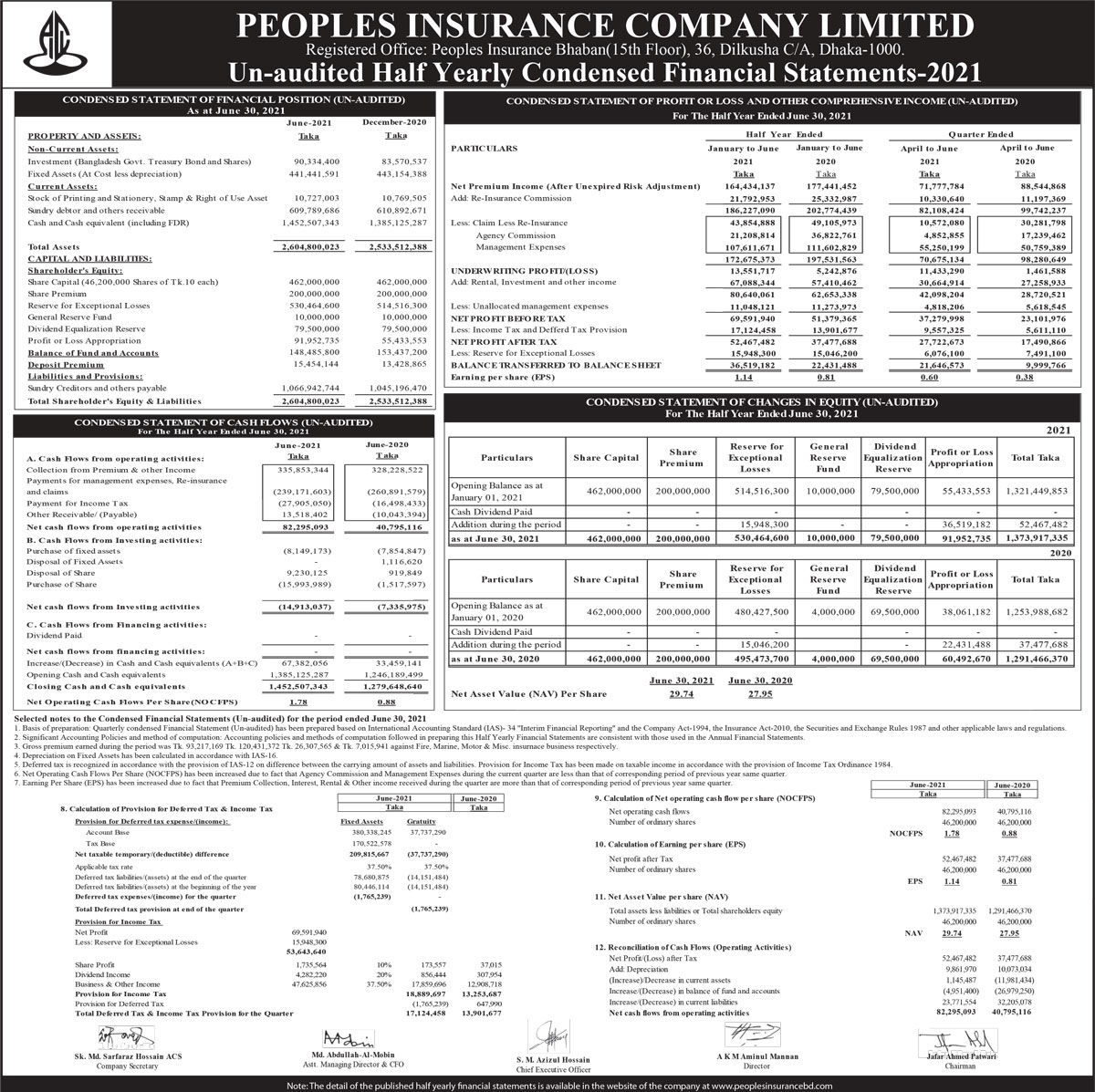 Un-audited Half Yearly Condensed Financial Statements of Peoples Insurance Company Limited