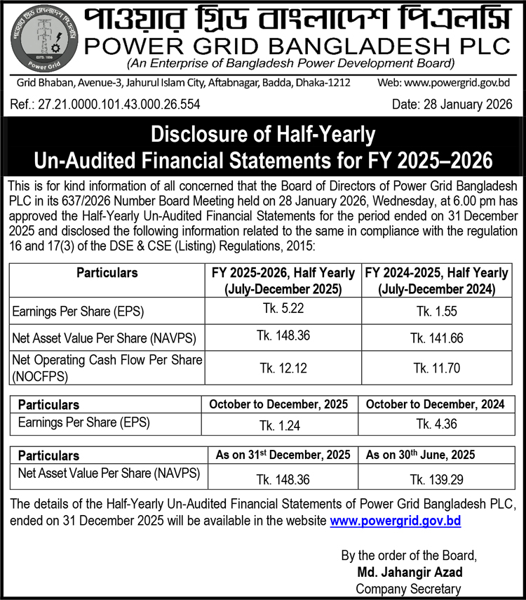 Q2 Un-audited Financial Statements of Power Grid Company of Bangladesh Ltd