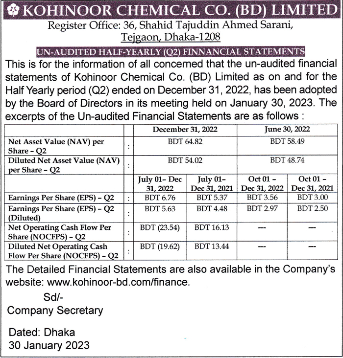 Un-audited Half-Yearly (Q2) Financial Statements of Kohinoor Chemical Company Ltd.