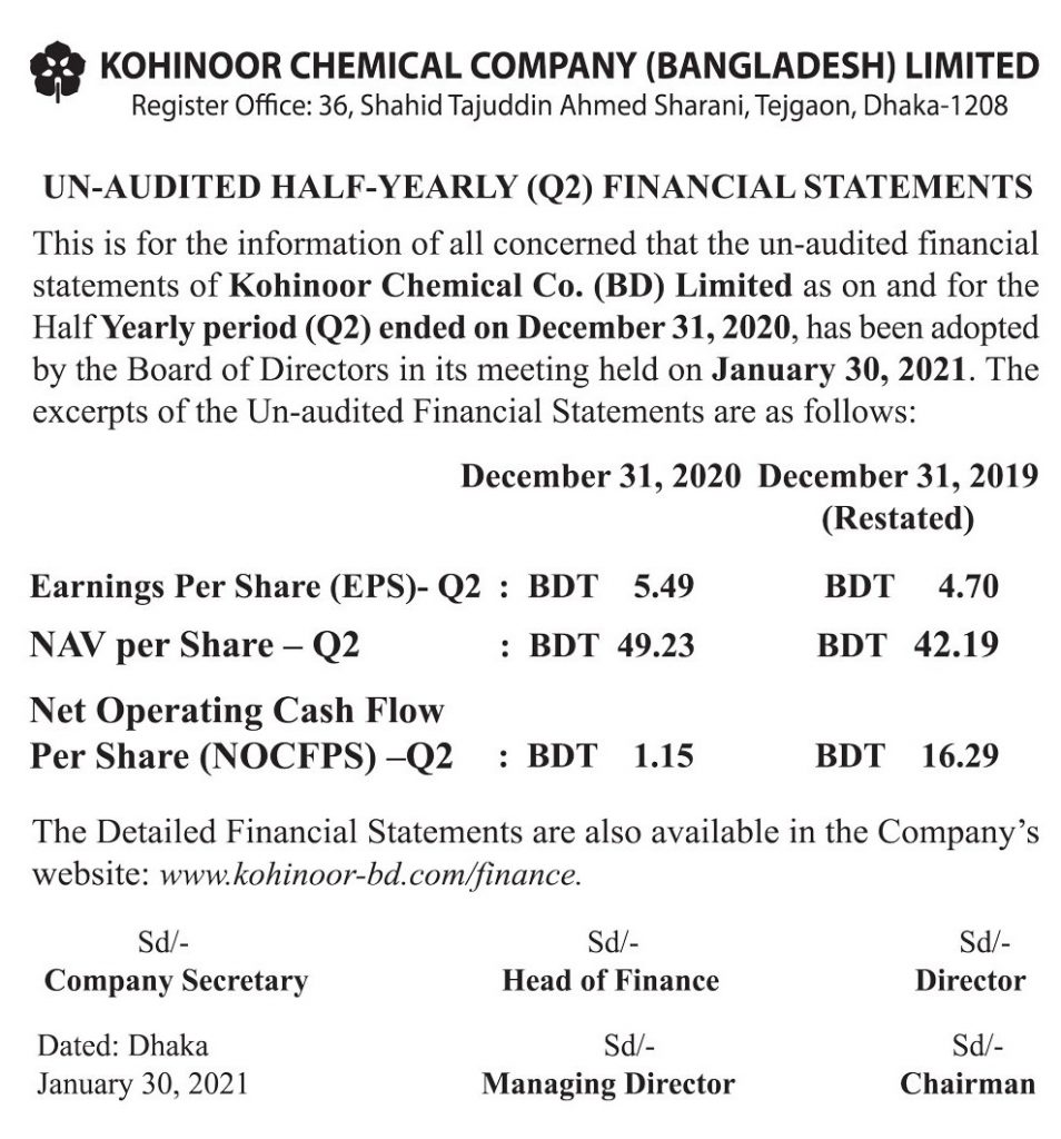 Q2 Un-audited Financial Statements of Kohinoor Chemical Company (Bangladesh) Limited