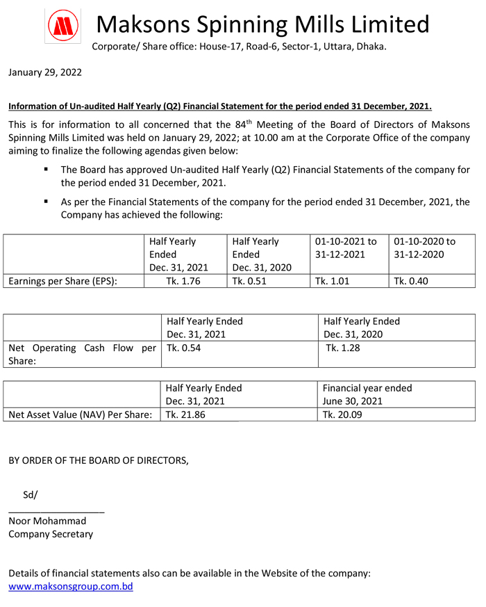 Un-audited Half Yearly (Q2) Financial Statements of Maksons Spinning Mills Limited