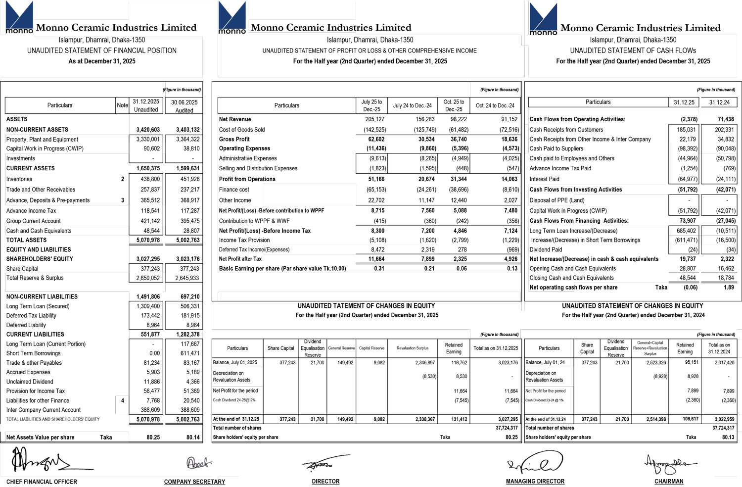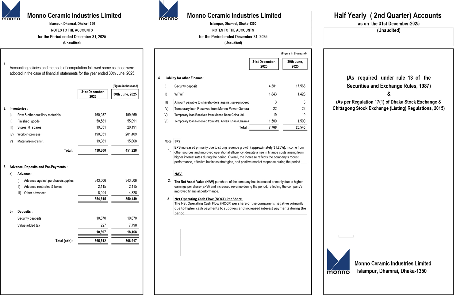 Un-audited Half Yearly (Q2) Financial Statements of Monno Ceramic Industries Ltd.