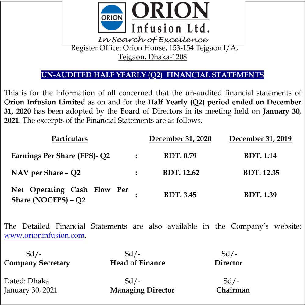 Un-audited Half Yearly (Q2) Financial Statements of Orion Infusion Ltd