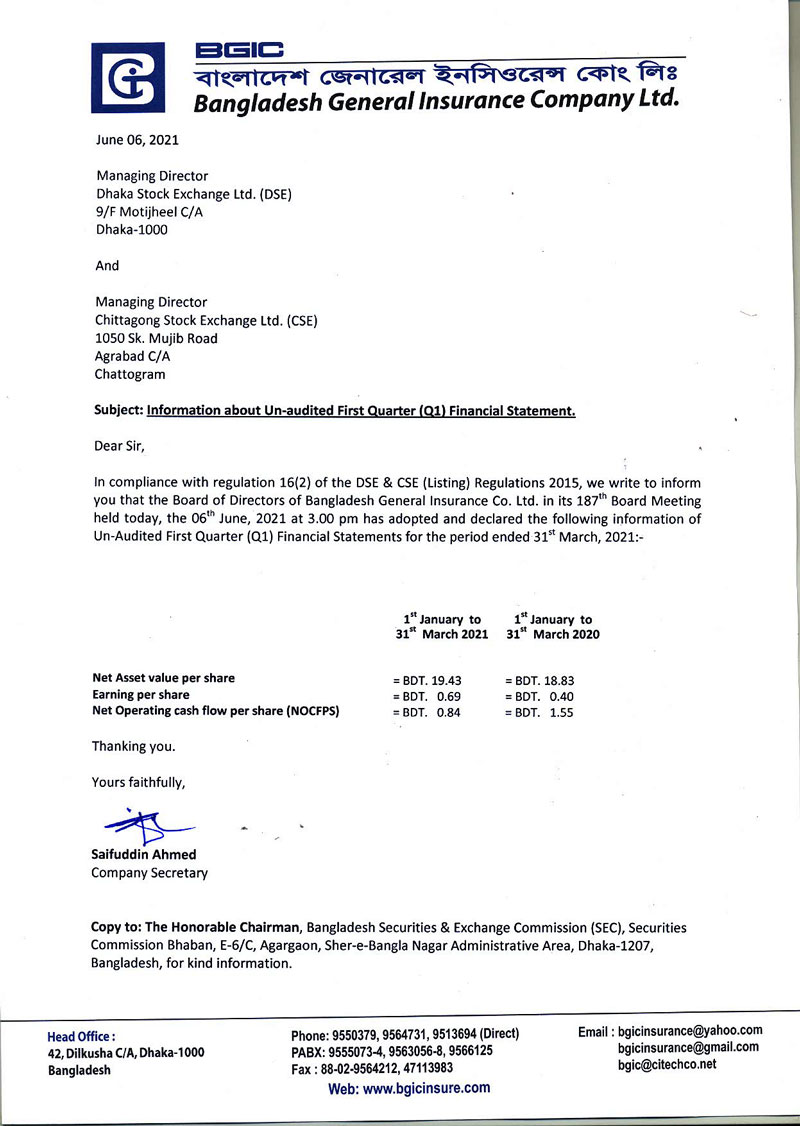 Price Sensitive Information (Q1) of Bangladesh General Insurance Company PLC