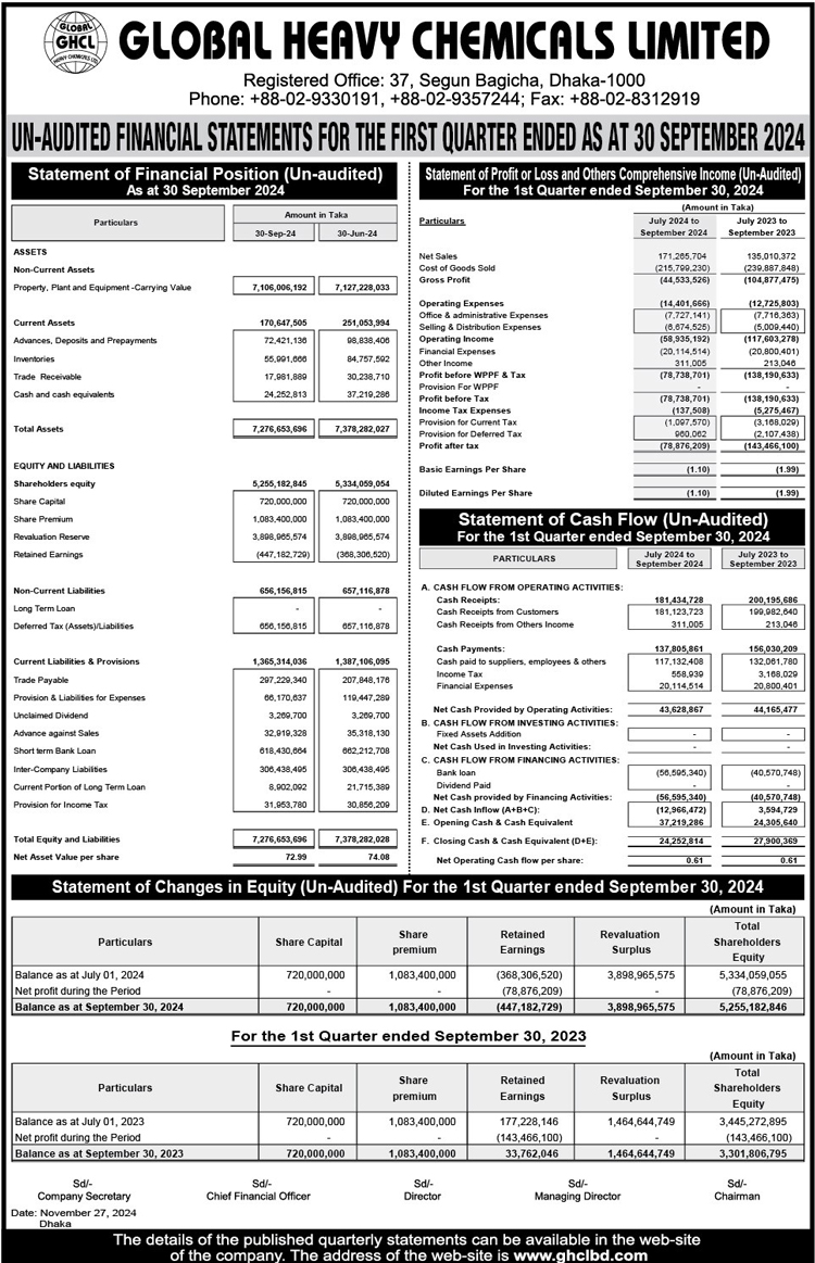 Un-audited Q1 Financial Statements of Global Heavy Chemicals Limited