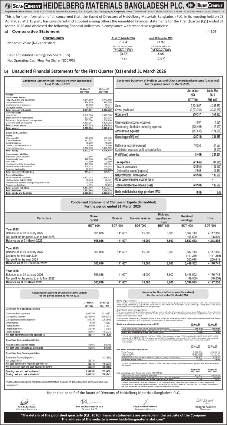 Un-audited Q1 Financial Statements of Heidelberg Materials Bangladesh PLC.