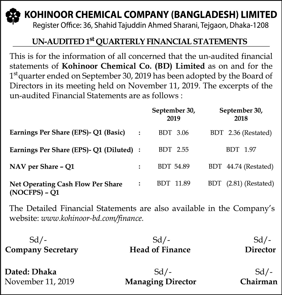 Un-audited Q1 Financial Statements of Kohinoor Chemical Company (BD) Ltd.