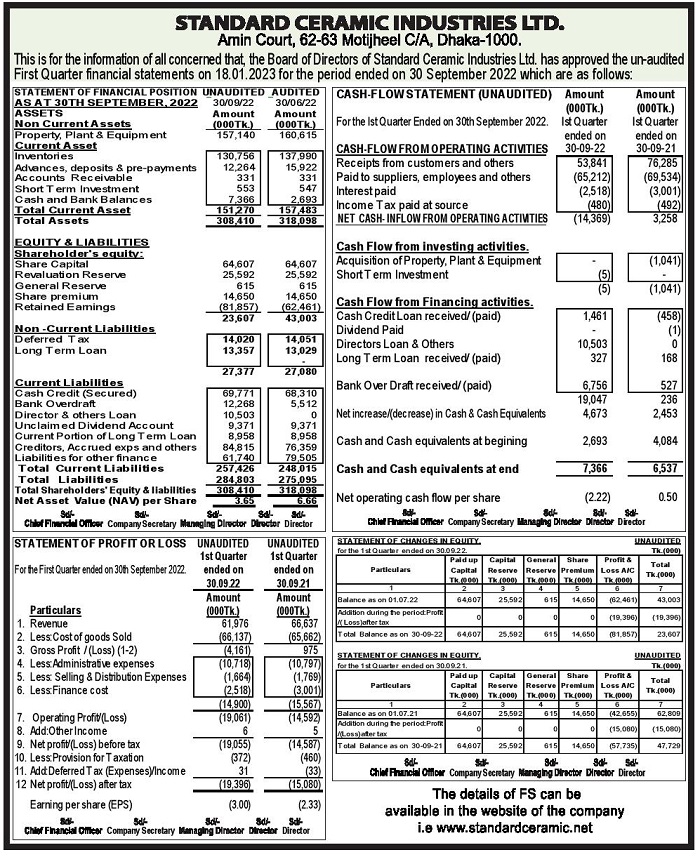 Q1 Un-audited Financial Statements of Standard Ceramic Industries Ltd