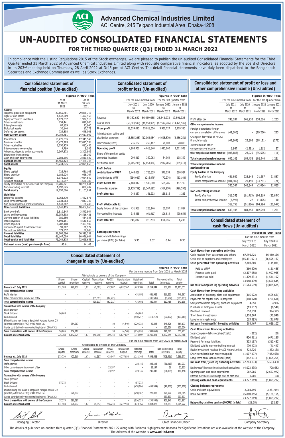 Un-audited Q3 Financial Statements of Advanced Chemical Industries Limited