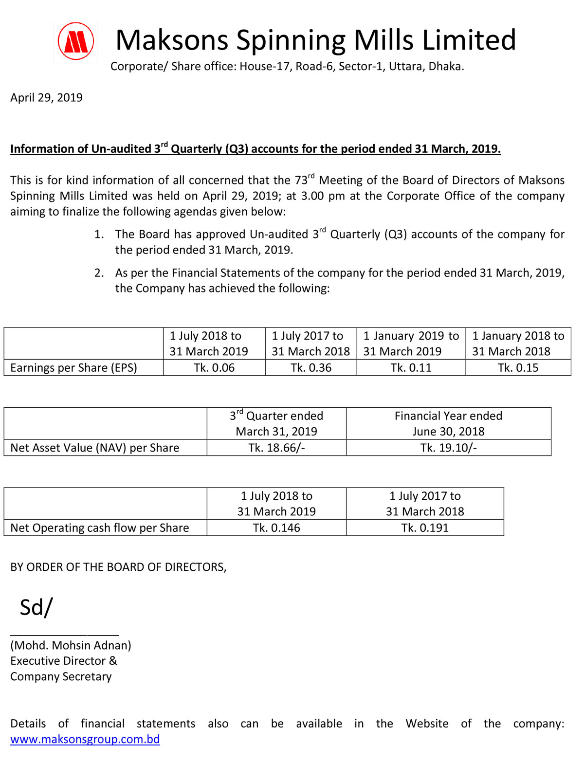 Un-audited Q3 Financial Statements of Maksons Spinning Mills Limited
