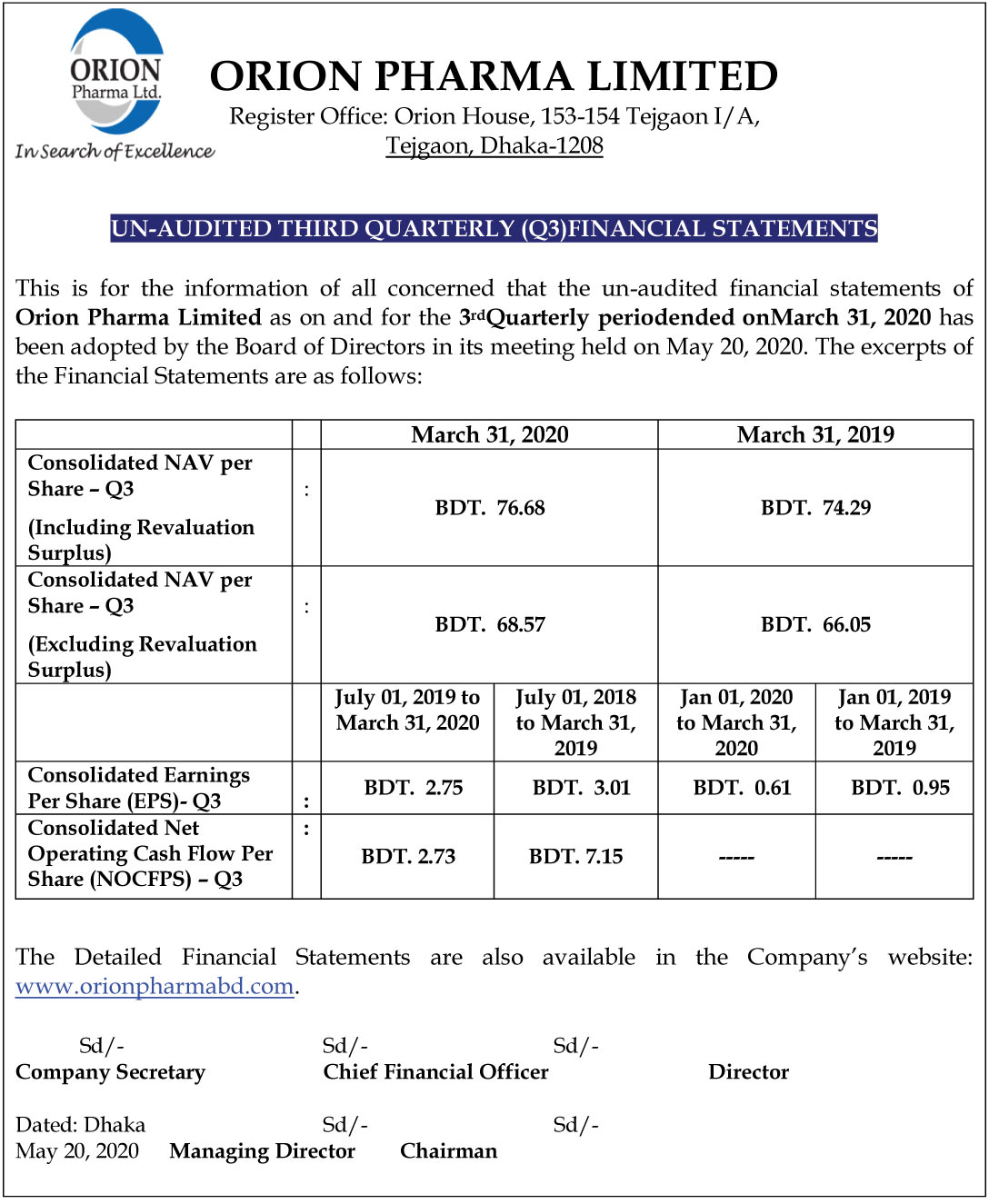 Un-audited Q3 Financial Statements of Orion Pharma Ltd