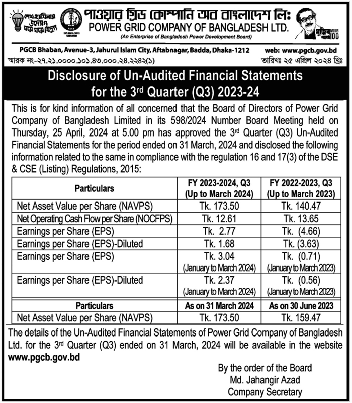 Un-audited Q3 Financial Statements of Power Grid Company of Bangladesh Ltd