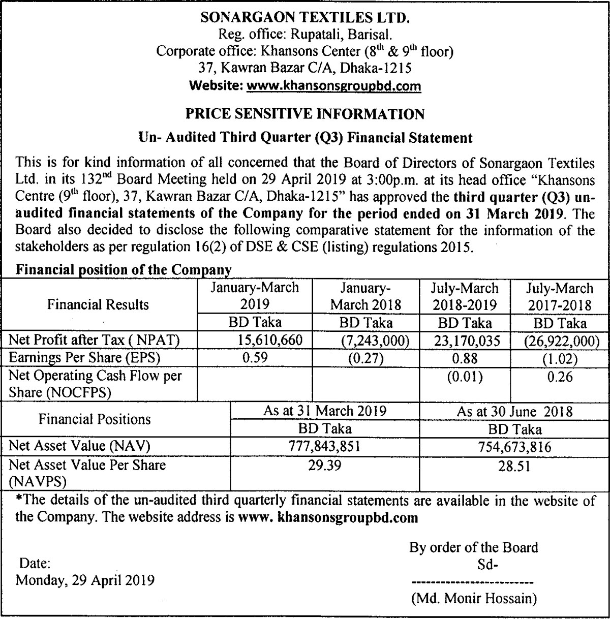 Q1 Financial Statements (Un-audited) of Sonargaon Textiles Ltd.