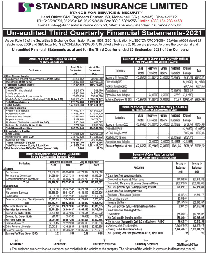 Q3 Un-audited Financial Statements of Standard Insurance Limited
