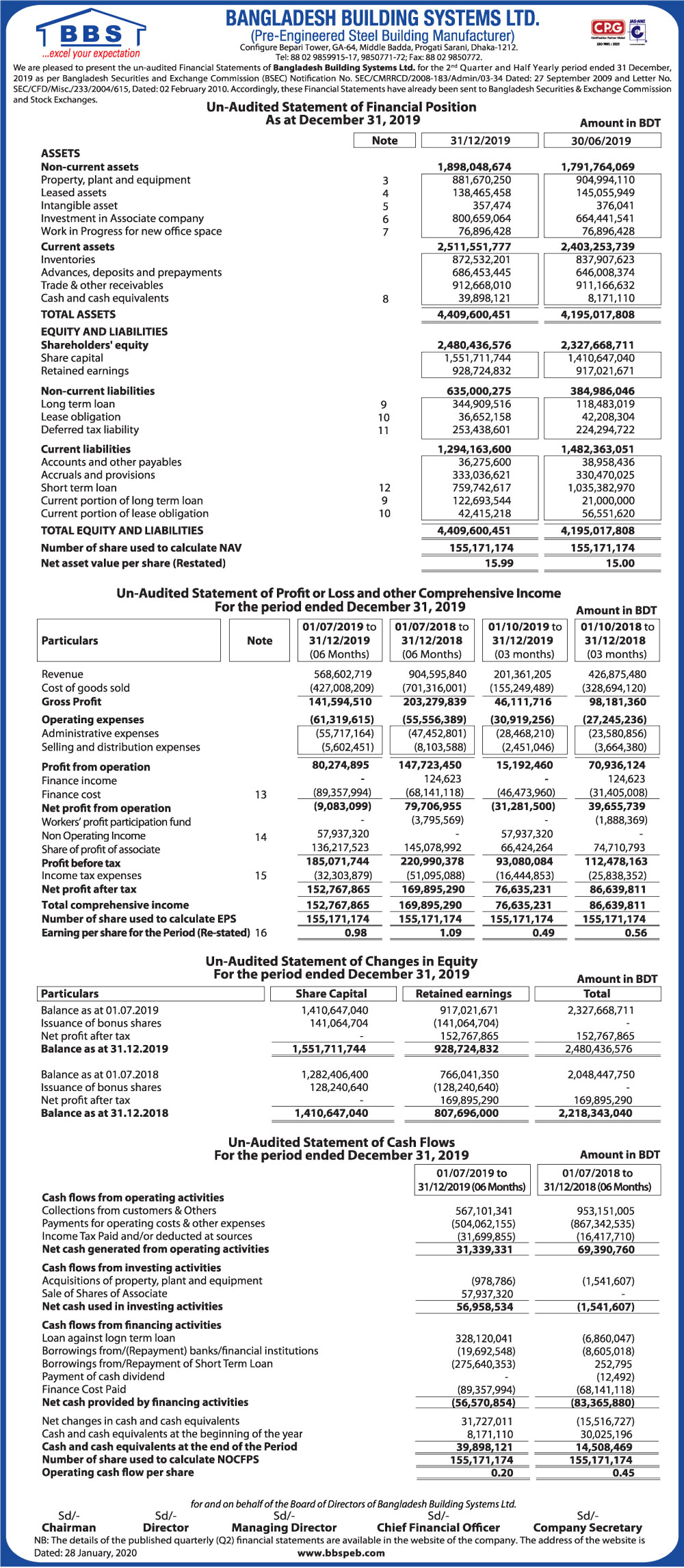 Q2 Financial Statements (Un-audited) of Bangladesh Building Systems Ltd.