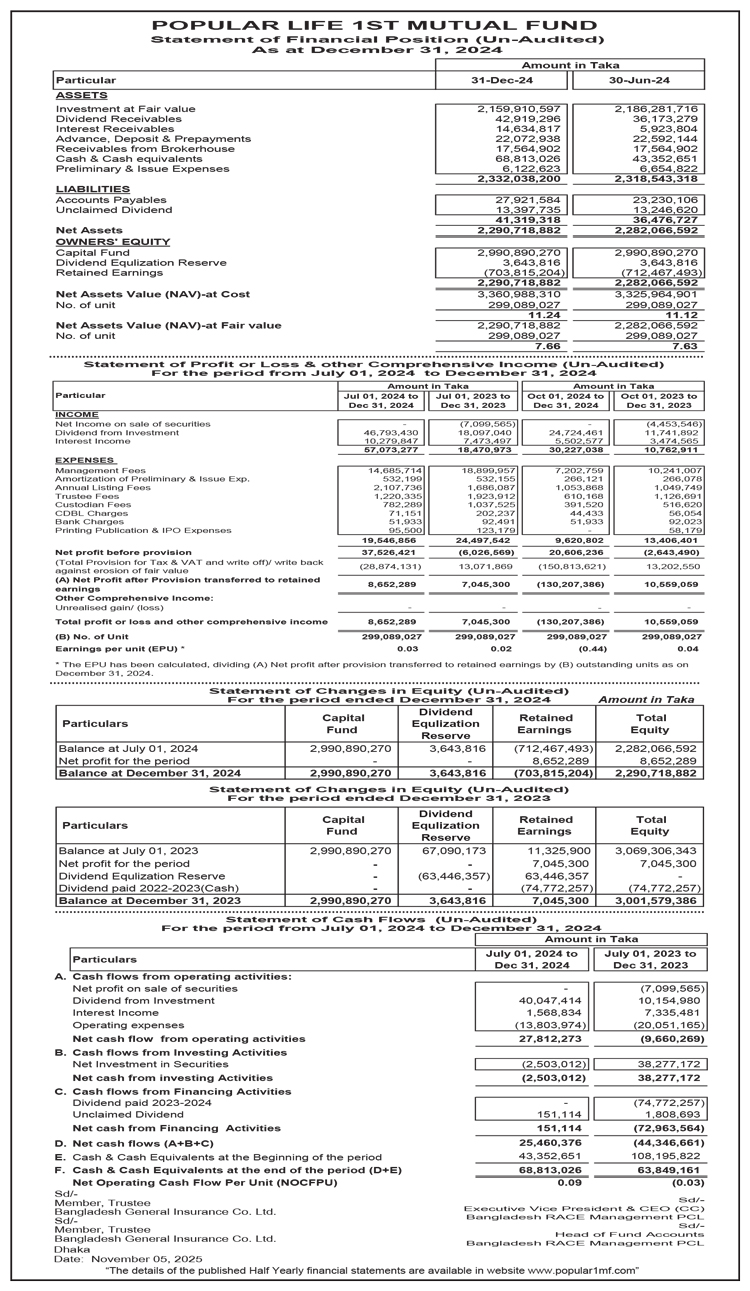 Un-audited Statements of Financial Position of Popular Life First Mutual Fund