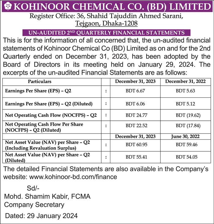 Un-udited Q2 Financial Statements of Kohinoor Chemicals Co. (BD) Limited