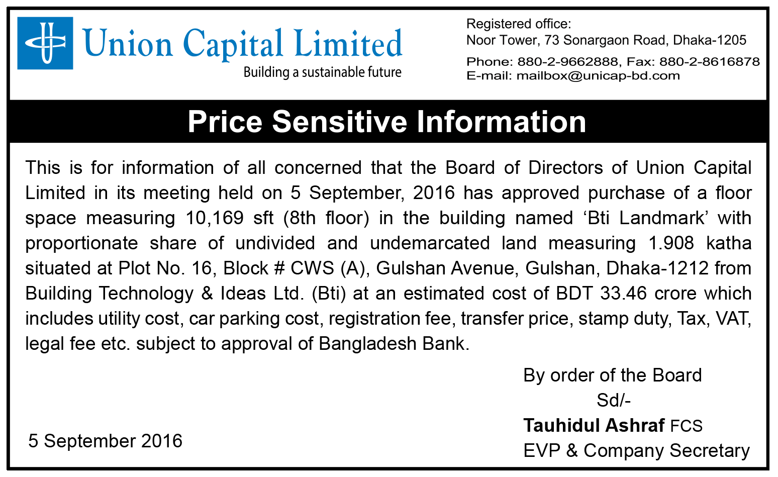 This is for information of all concerned that the Board of Directors of Union Capital Limited in its meeting held on 5 September, 2016 has approved purchase of a floor