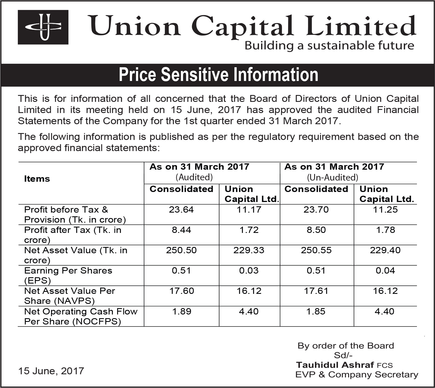 Price Sensitive Information for the First Quarter 2025 of Union Capital Limited