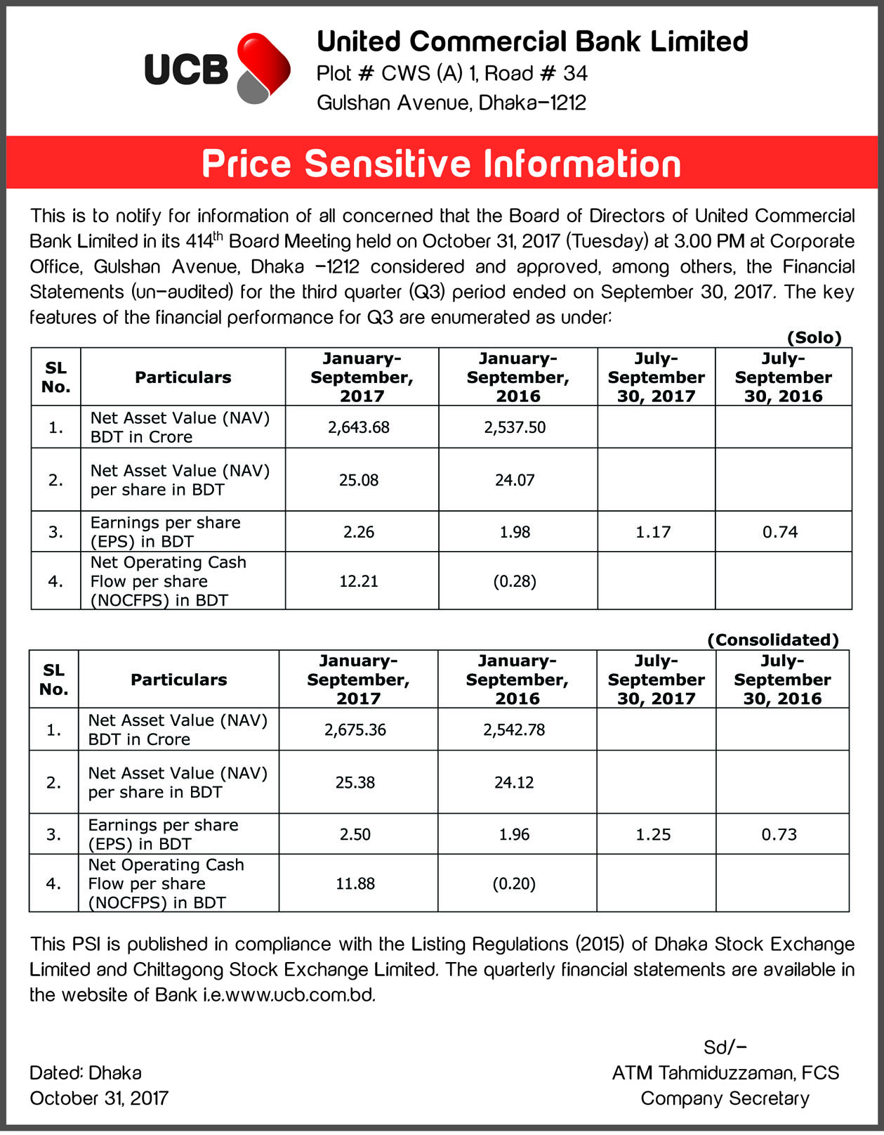 Price Sensitive Information of United Commercial Bank PLC (UCB)