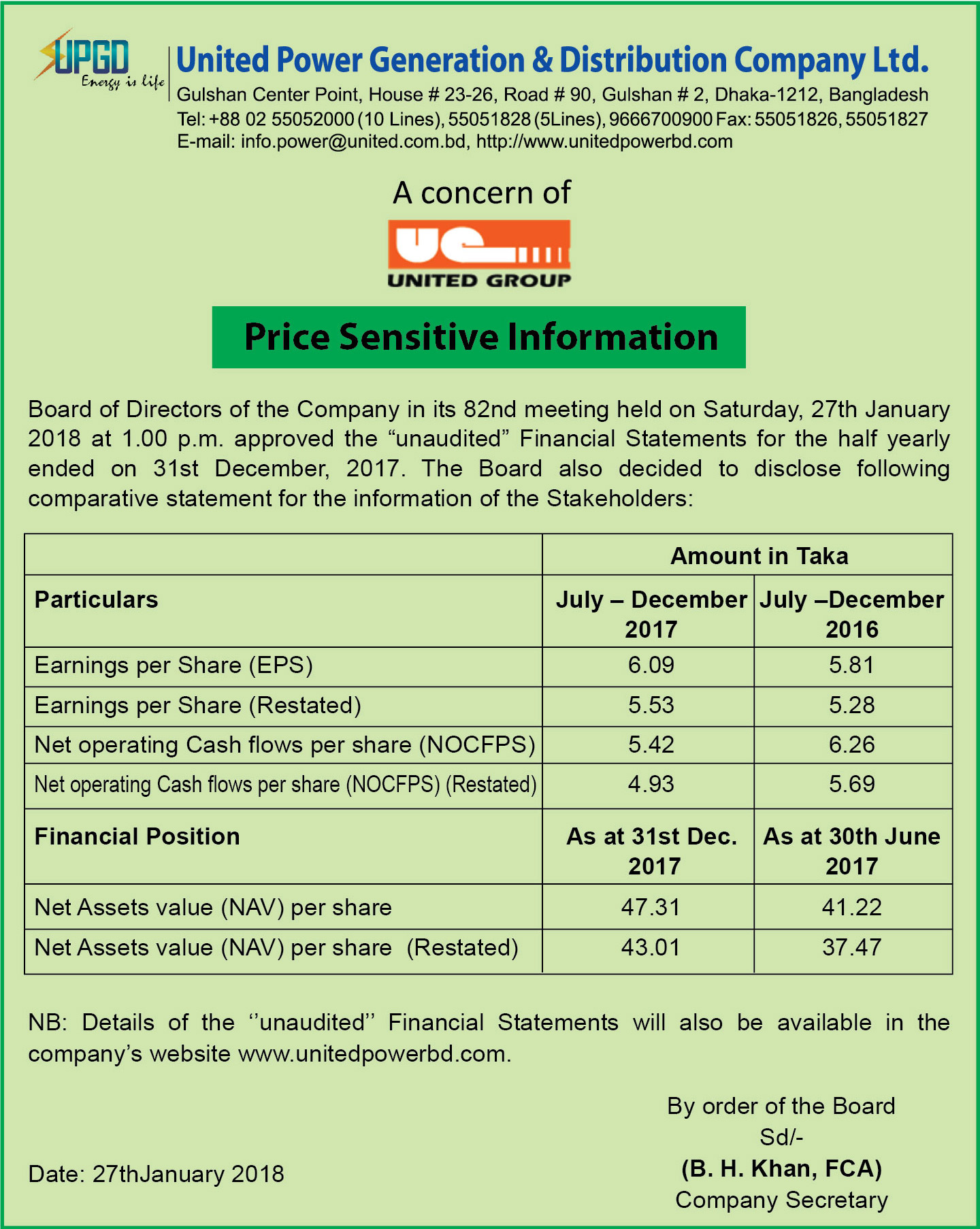 United Power Generation & Distribution Company Limited Price Sensitive Information