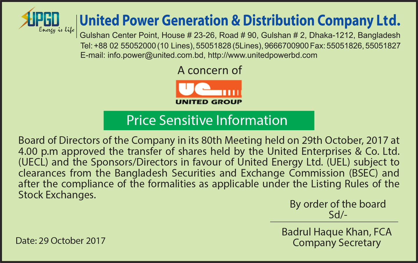 Price Sensitive Information of United Power Generation & Distribution Company Ltd