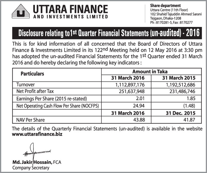 Uttara Finance and Investments Limited 1Q Price Sensitive Information