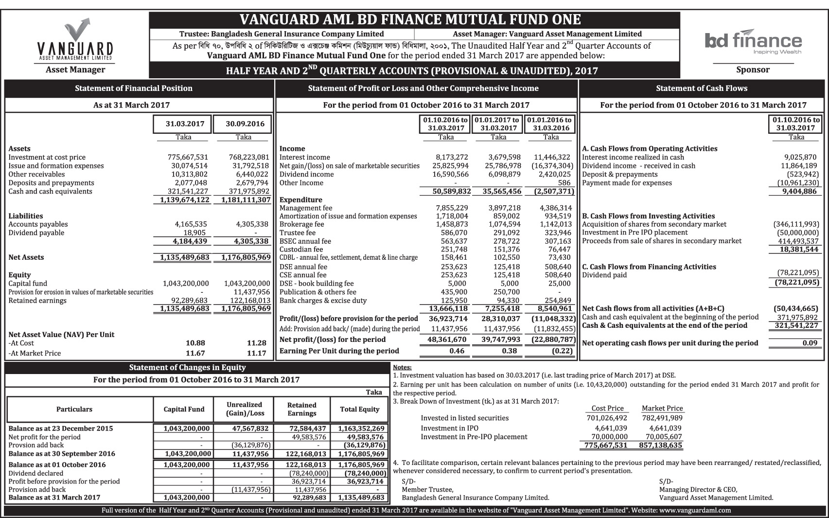 Half Yarly (Q2) Financial Statements (Provisional & Unaudited) of Vanguard AML BD Finance Mutual Fund One