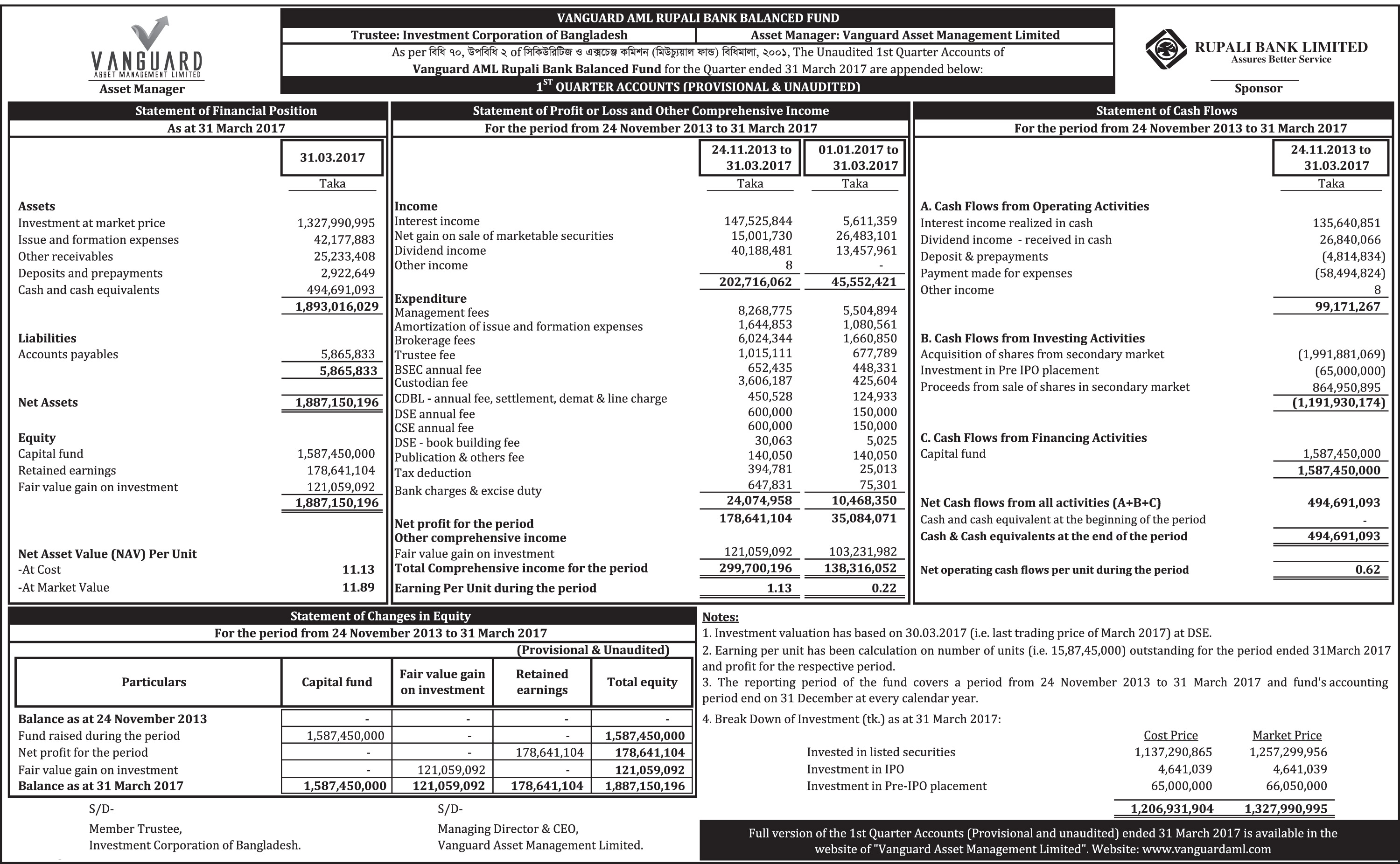Vanguard AML Rupali Bank Balanced Fund 1Q Account (Provisional and Unaudited)