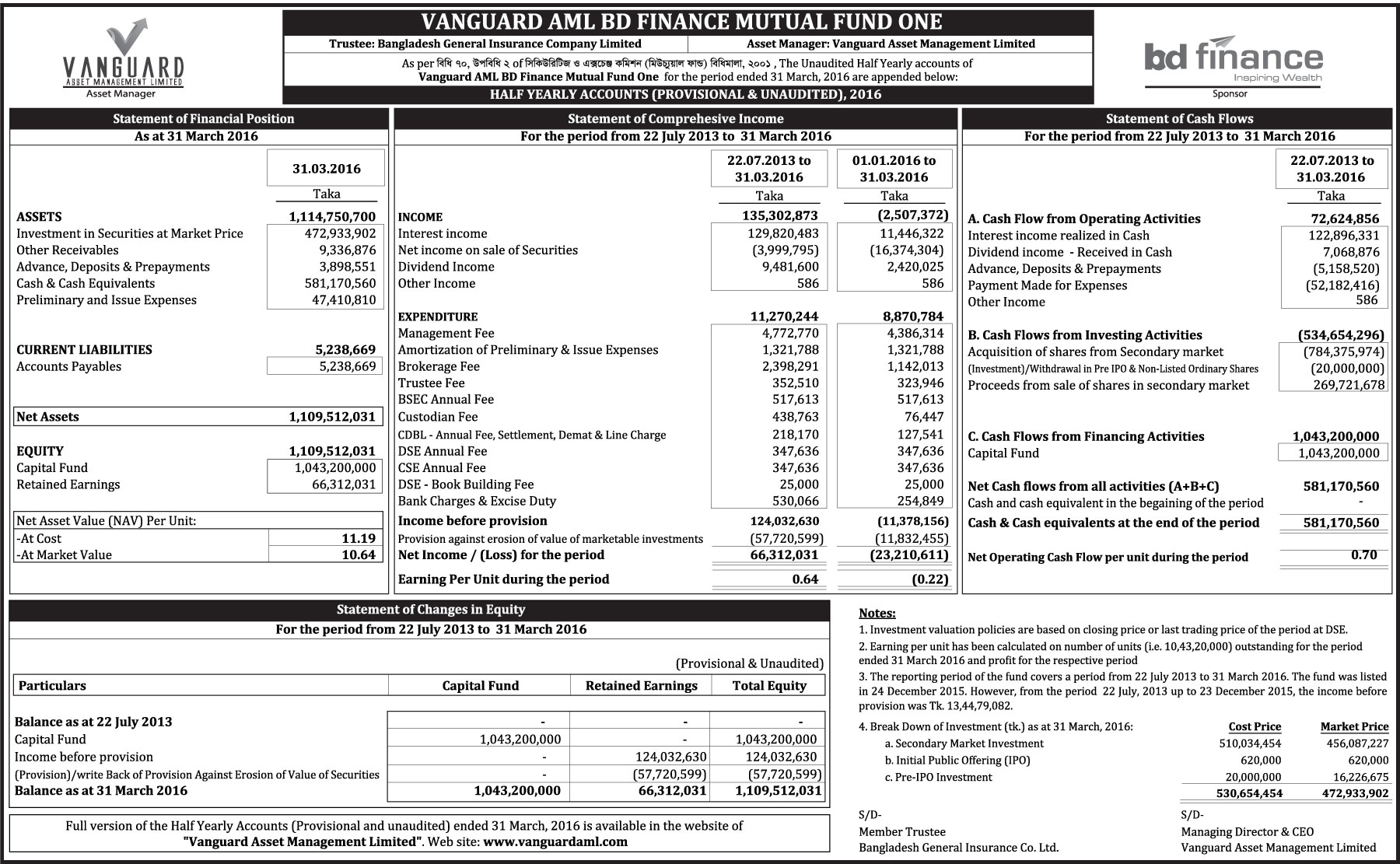 Vangurd AML BD Finance Mutual Fund One half Yearly Statement