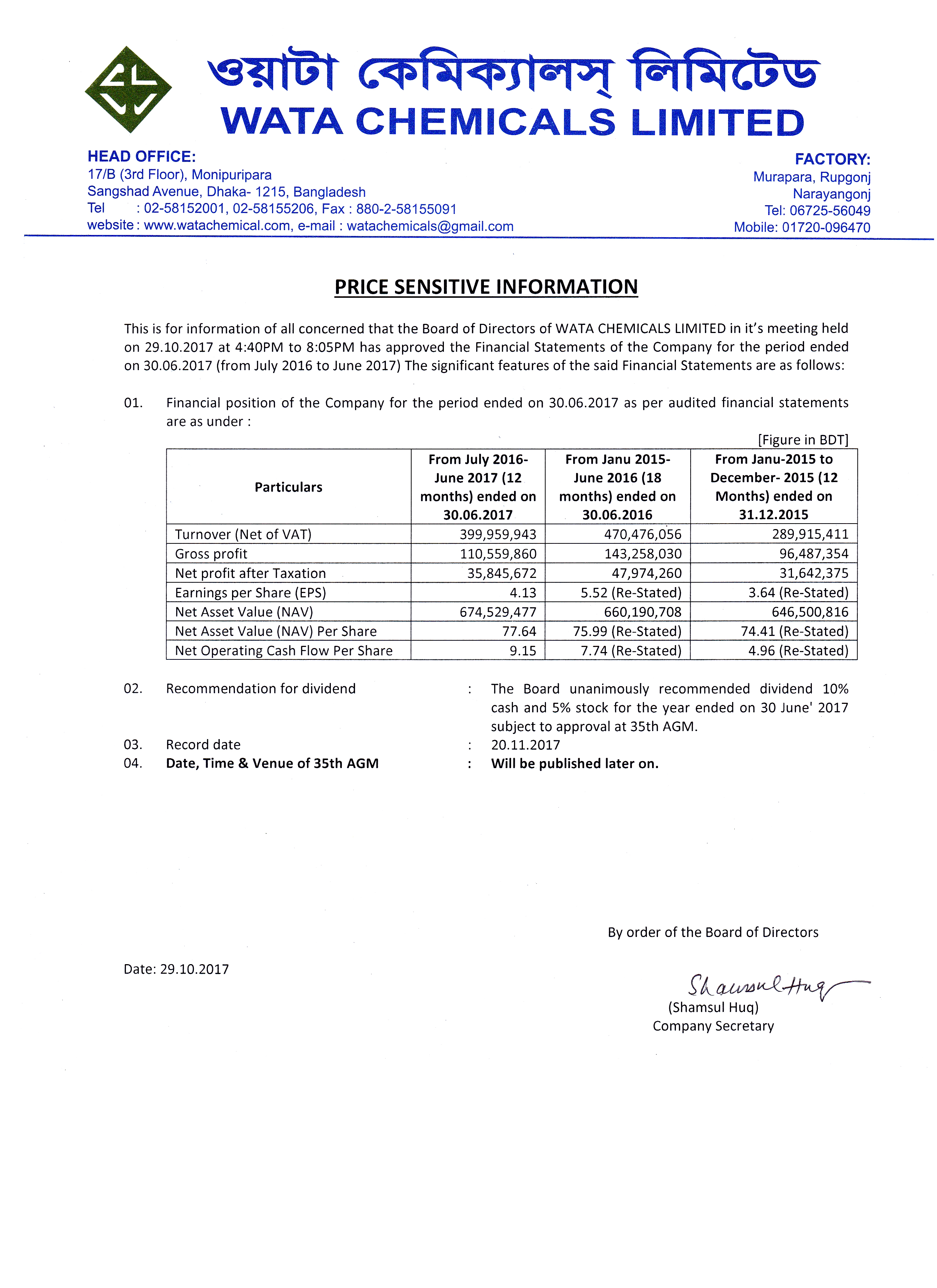 WATA CHEMICALS LIMITED PRICE SENSITIVE INFORMATION