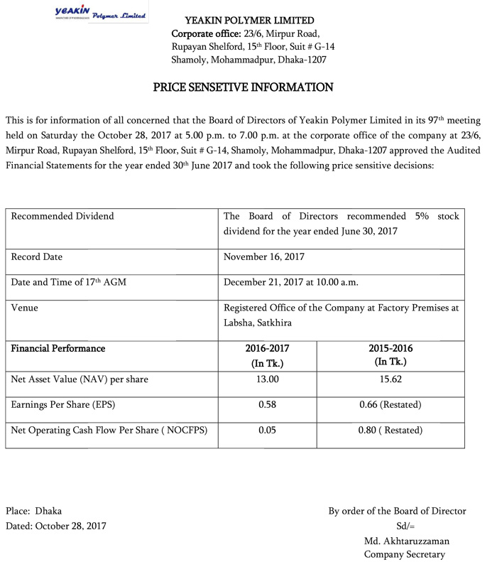 Price Sensitive Information of Yeakin Polymer Limited