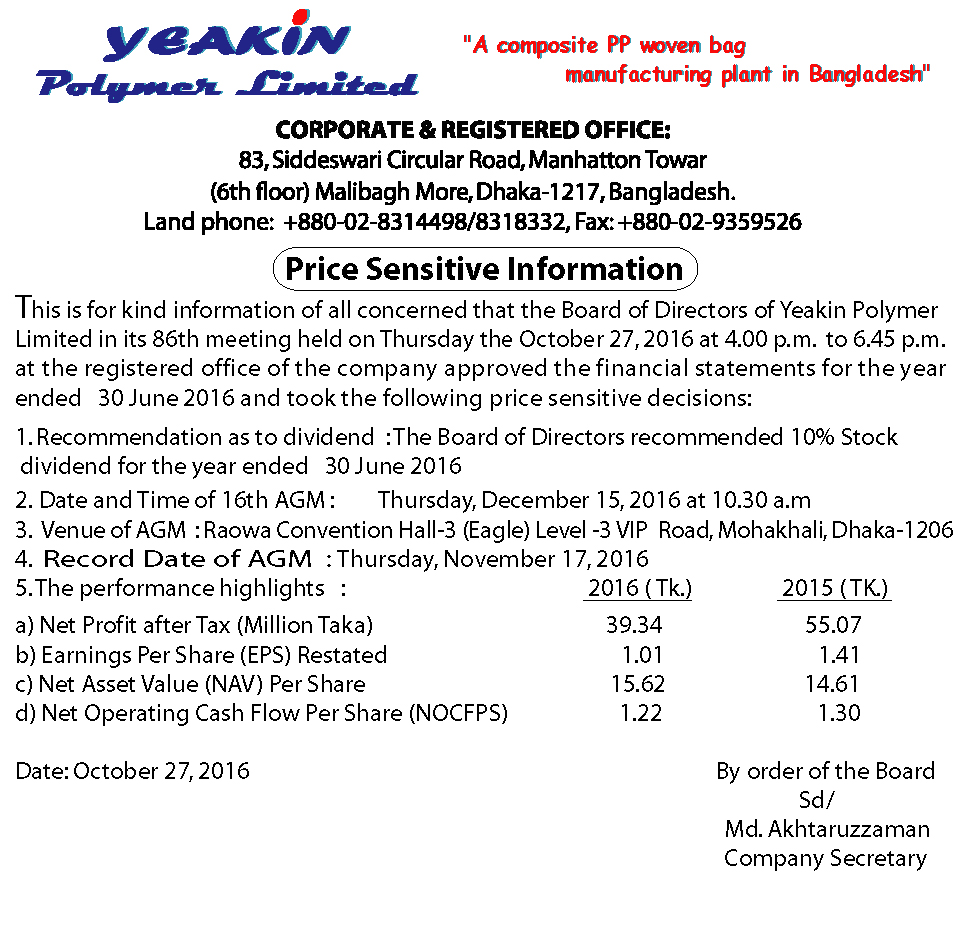Q2 Financial Statements (Un-audited) of Yeakin Polymer Limited