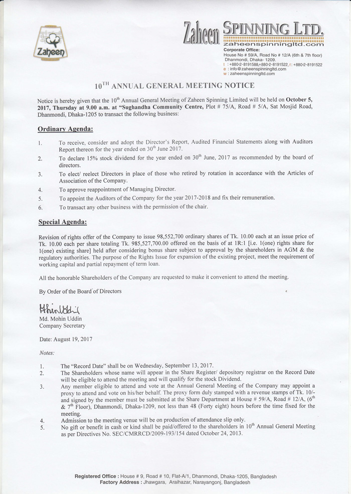 Zaheen Spinning Limited 10th Annual General Meting Notice