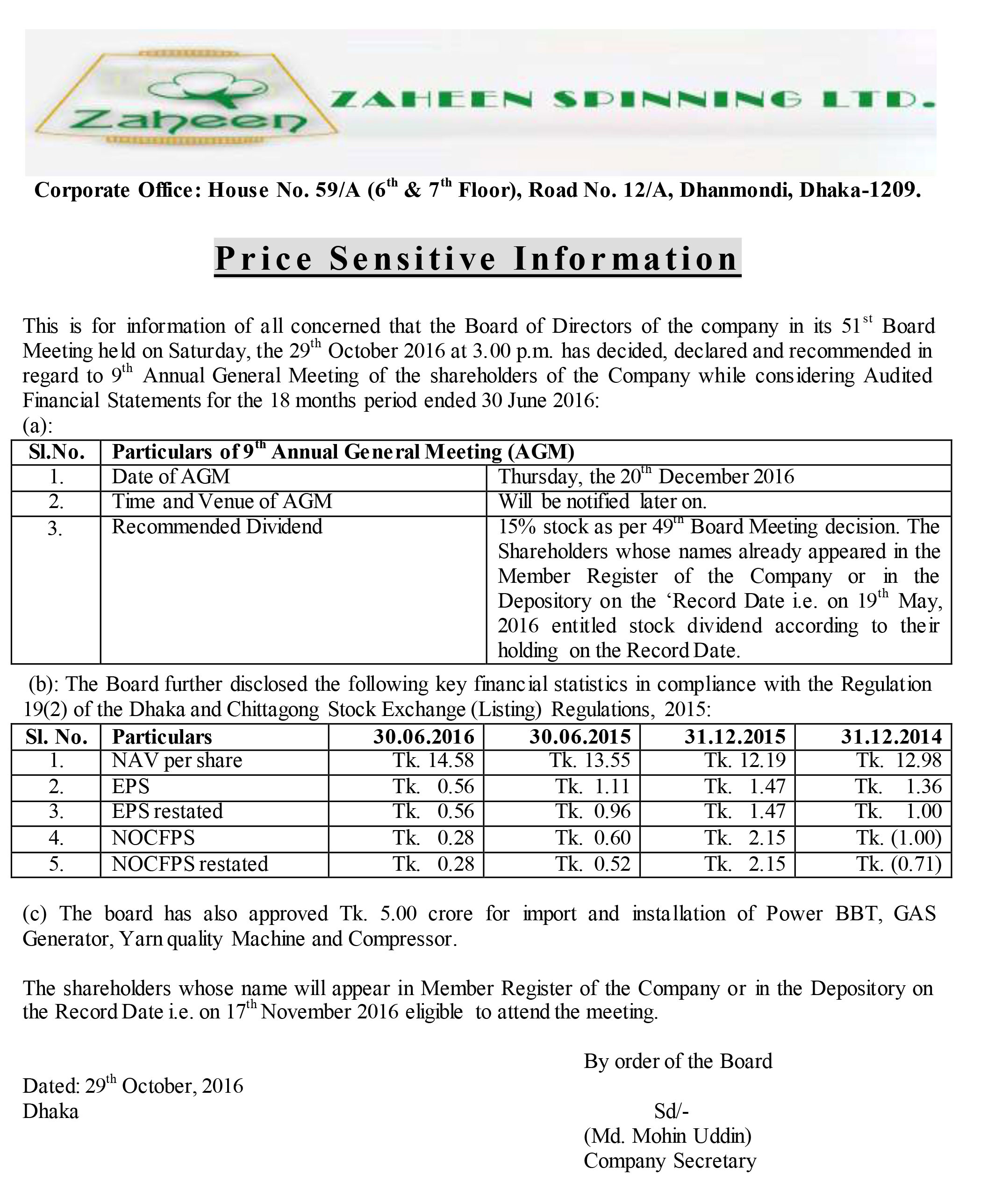 Zaheen Spinning Limited Price Sensitive Information 2016