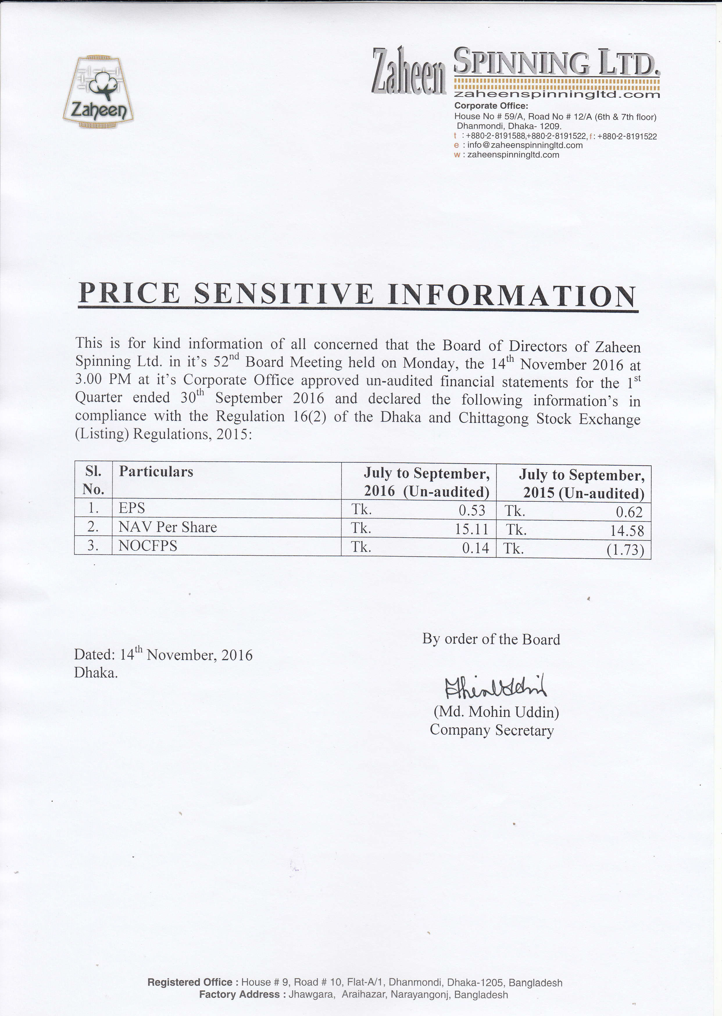 Zaheen Spinning Limited Price Sensitive Information November 2016