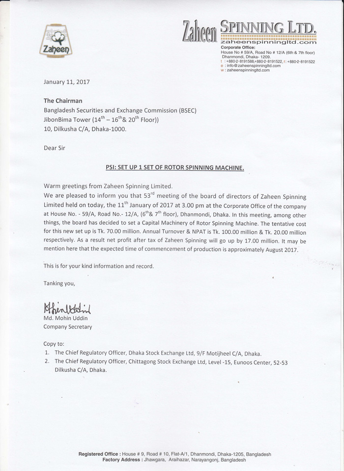 Price Sensitive Information of Zaheen Spinning PLC.