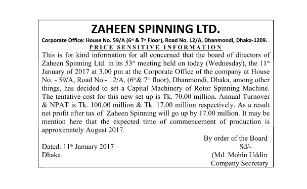 Price Sensitive Information of Zaheen Spinning Limited