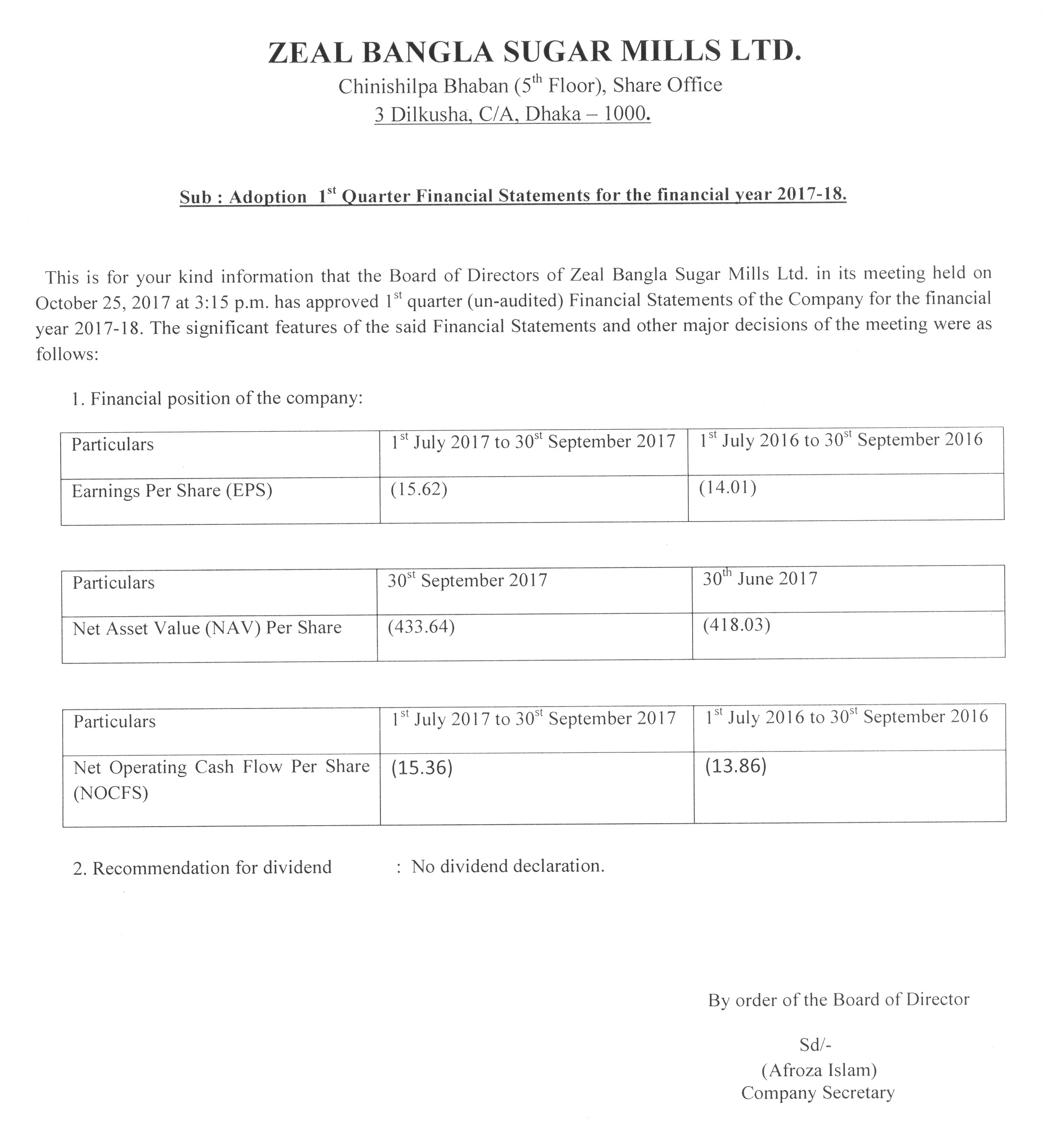 Q1 Financial Statements of Zeal Bangla Sugar Mills Ltd