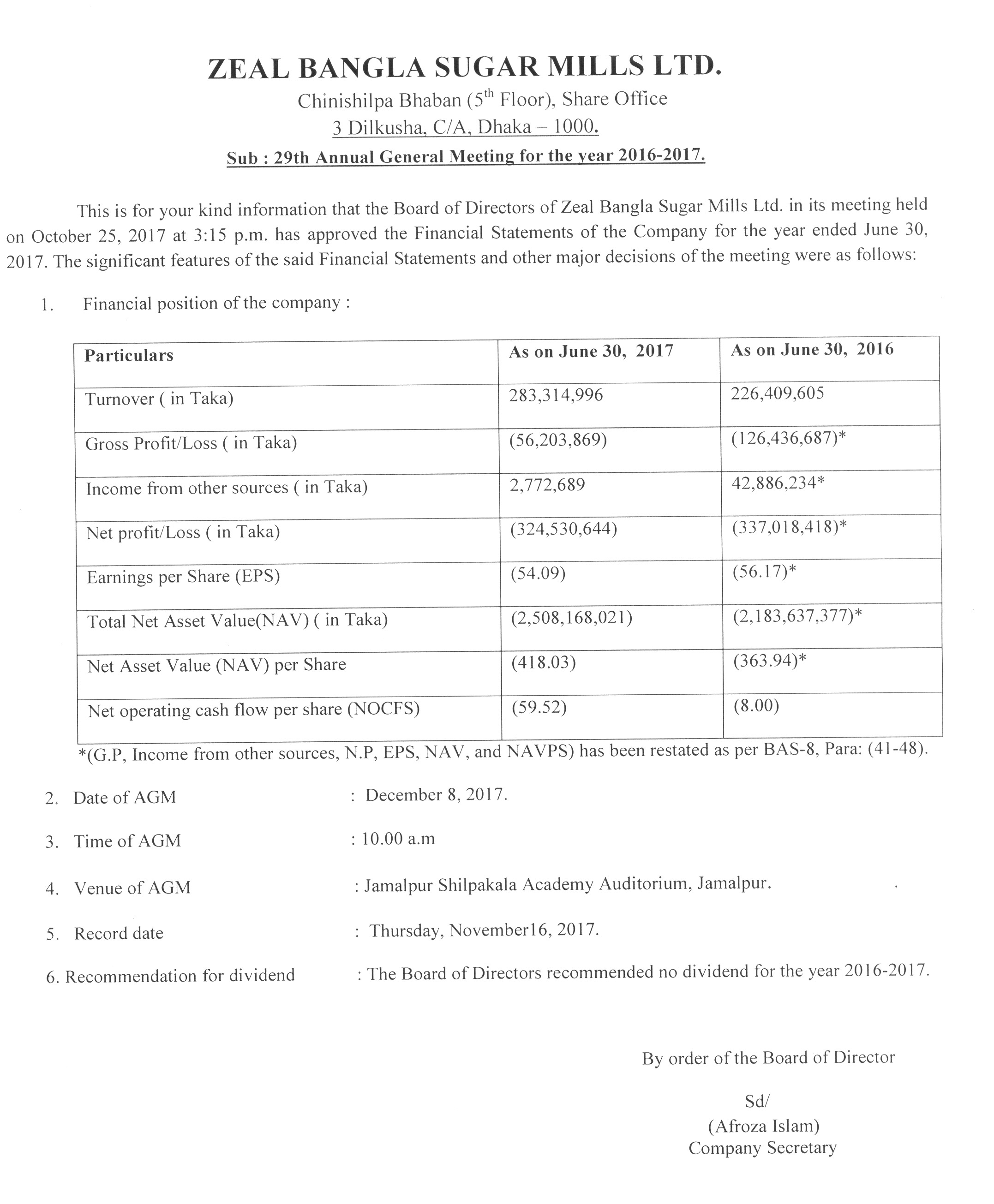 30th Annual General Meeting of Zeal Bangla Sugar Mills Ltd