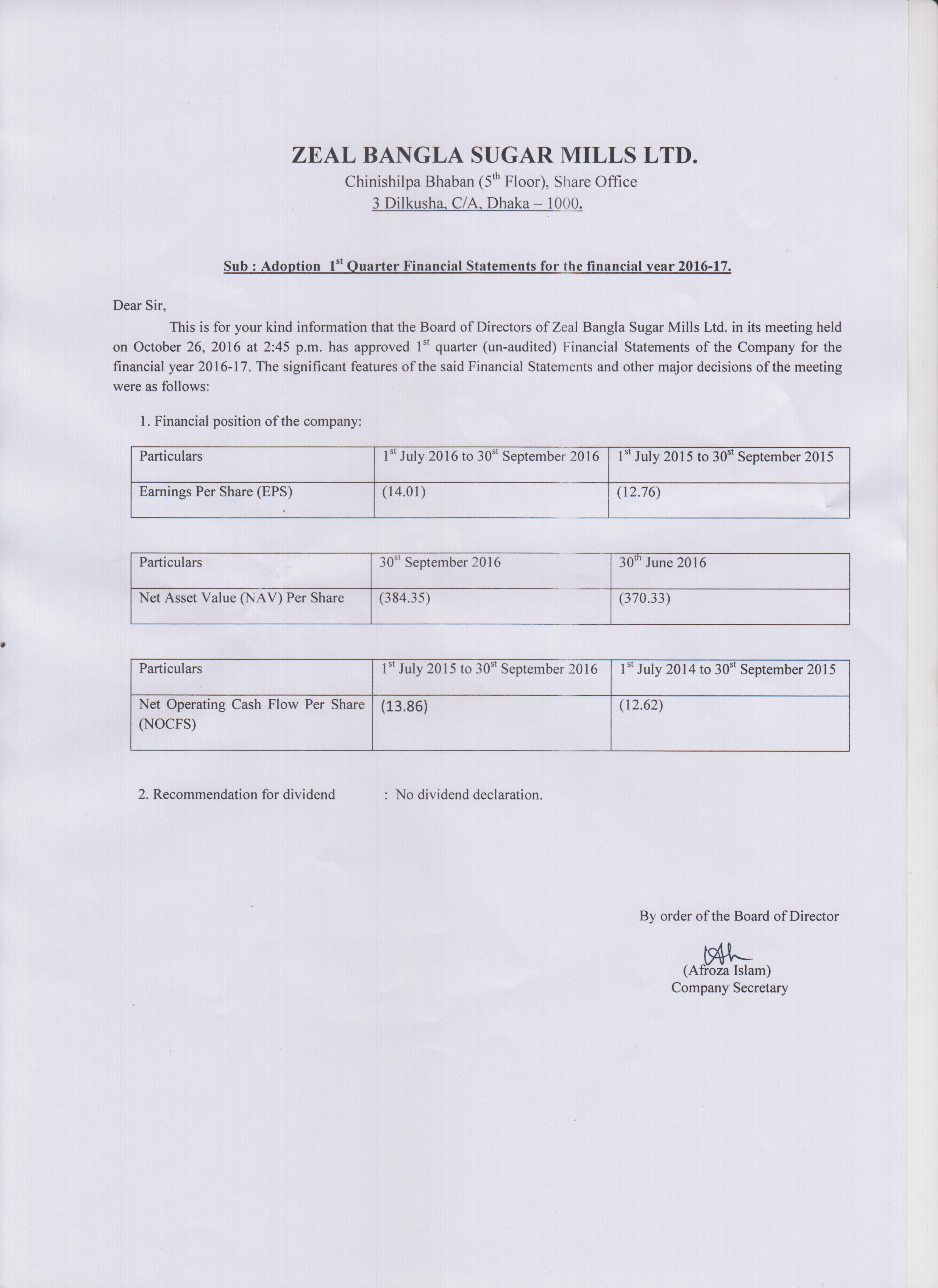 Zeal Bangla Sugar Mills Ltd 1st Quarter Financial Statements